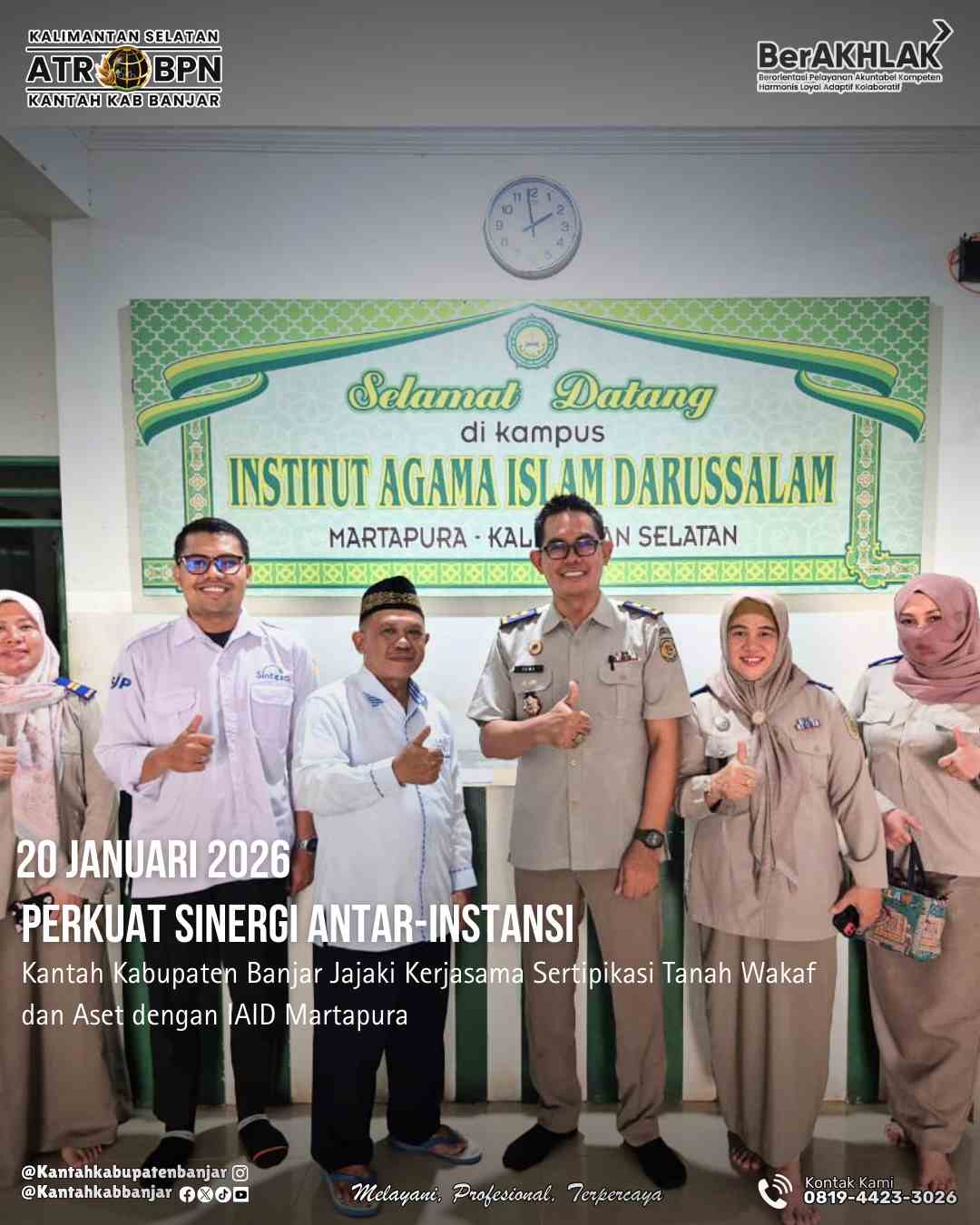Jelajah Kalimantan News, Martapura – Kantor Pertanahan Kabupaten Banjar melakukan langkah proaktif dalam meningkatkan pelayanan publik dan pengamanan aset negara melalui inisiasi kerjasama dengan Institut Agama Islam Darussalam (IAID) Martapura. Kegiatan koordinasi ini merupakan tindak lanjut dari surat permohonan kerjasama yang diajukan oleh Kepala Kantor Pertanahan Kabupaten Banjar, Langlang Tresna Permagati, S.SiT., M.H., Selasa (20/1/2026)