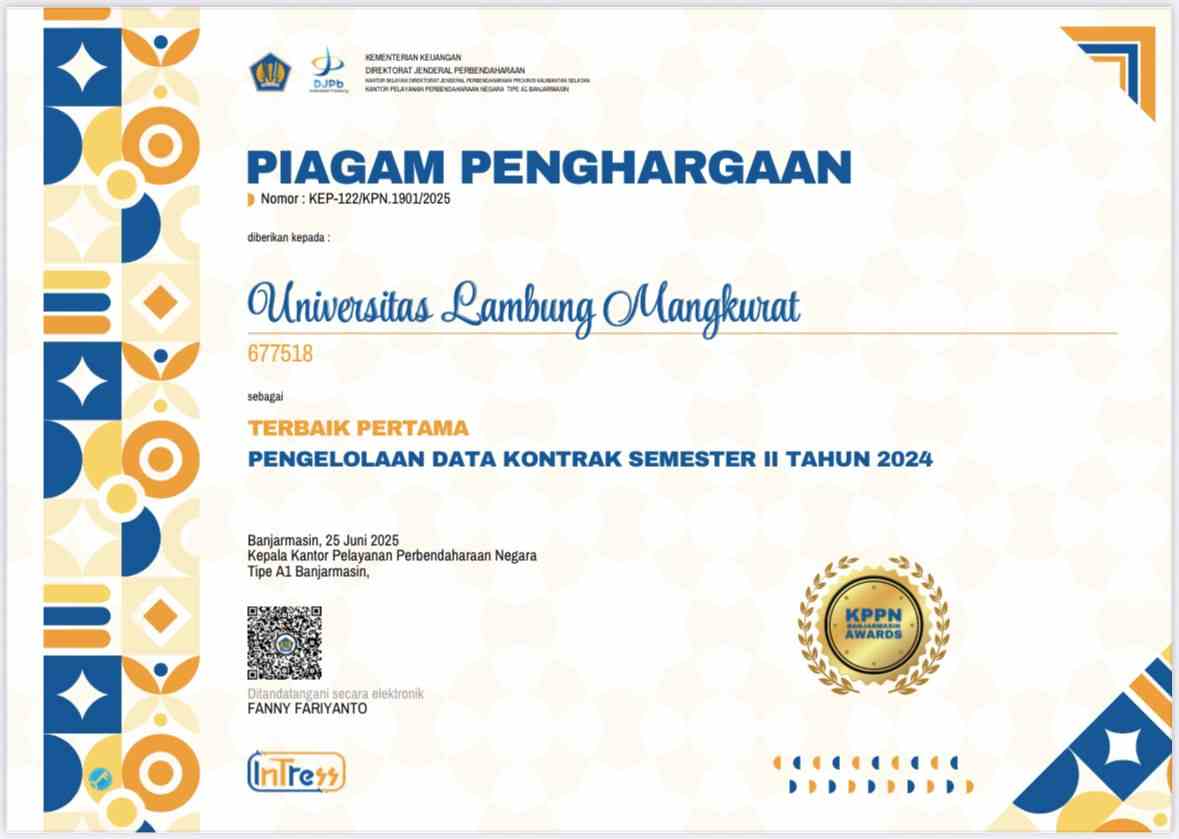 Jelajah Kalimantan News, Banjarmasin – Universitas Lambung Mangkurat (ULM) kembali mencatat prestasi membanggakan di bidang pengelolaan keuangan negara. ULM berhasil meraih Penghargaan Terbaik Pertama dalam Pengelolaan Data Kontrak Semester II Tahun 2024 yang diberikan oleh Direktorat Jenderal Perbendaharaan (DJPb) melalui Kantor Pelayanan Perbendaharaan Negara (KPPN) Tipe A1 Banjarmasin.